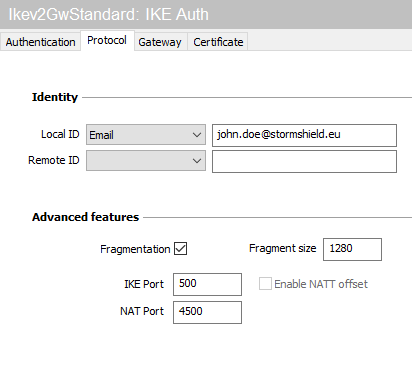 - Dans l'onglet Protocole > Fonctions avancées, cochez la case Fragmentation et indiquez la taille des fragments IKE tels que définis au niveau du firewall (1280 octets selon les recommandations de Stormshield).