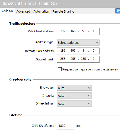 - Dans l'onglet Child SA > Trafic sélecteurs > champ Type d'adresse, sélectionnez Adresse réseau.