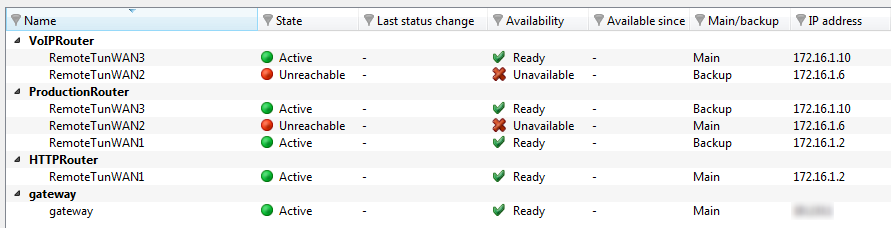 Dans l'illustration ci-dessus, le lien WAN2 n'est plus opérationnel. La passerelle RemoteTunWAN2 apparaît alors comme injoignable et donc non disponible. Pour le routeur ProductionRouter, les deux passerelles RemoteTunWAN1 et RemoteTunWAN3 sont devenues actives et les flux de production empruntent alors les tunnels portés par les liens WAN1 et WAN3.