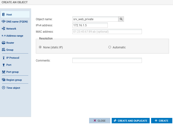 Cet objet est indispensable afin de pouvoir configurer des règles impliquant le serveur web dans la politique de sécurité du firewall (configuration à venir dans notre exemple).