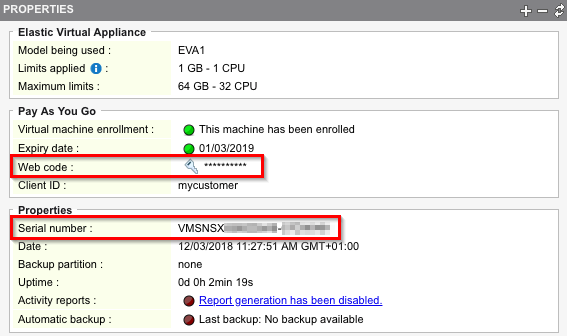 Sur le Tableau de bord, le widget Propriétés affiche le nouveau modèle de firewall virtuel (par exemple VPAYG-EVA2 pour une mémoire de 3 Go) ainsi que les nouvelles limites de ce modèle. Pour plus d'informations sur les limites de chaque modèle, reportez-vous à la section Consulter le tableau de bord du firewall virtuel dans l'interface Web d'administration.