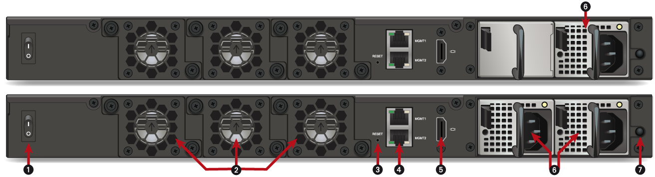 | 4 | Deux ports dédiés au management du produit (MGMT1 et MGMT2). Les ports MGMT sont des interfaces réseau dédiées à la gestion du firewall, mais ils peuvent également être utilisés pour gérer et/ou transférer le trafic de paquets comme des interfaces réseau courantes. Ils ne fournissent pas de fonctionnalité hors bande (out-of-band). |