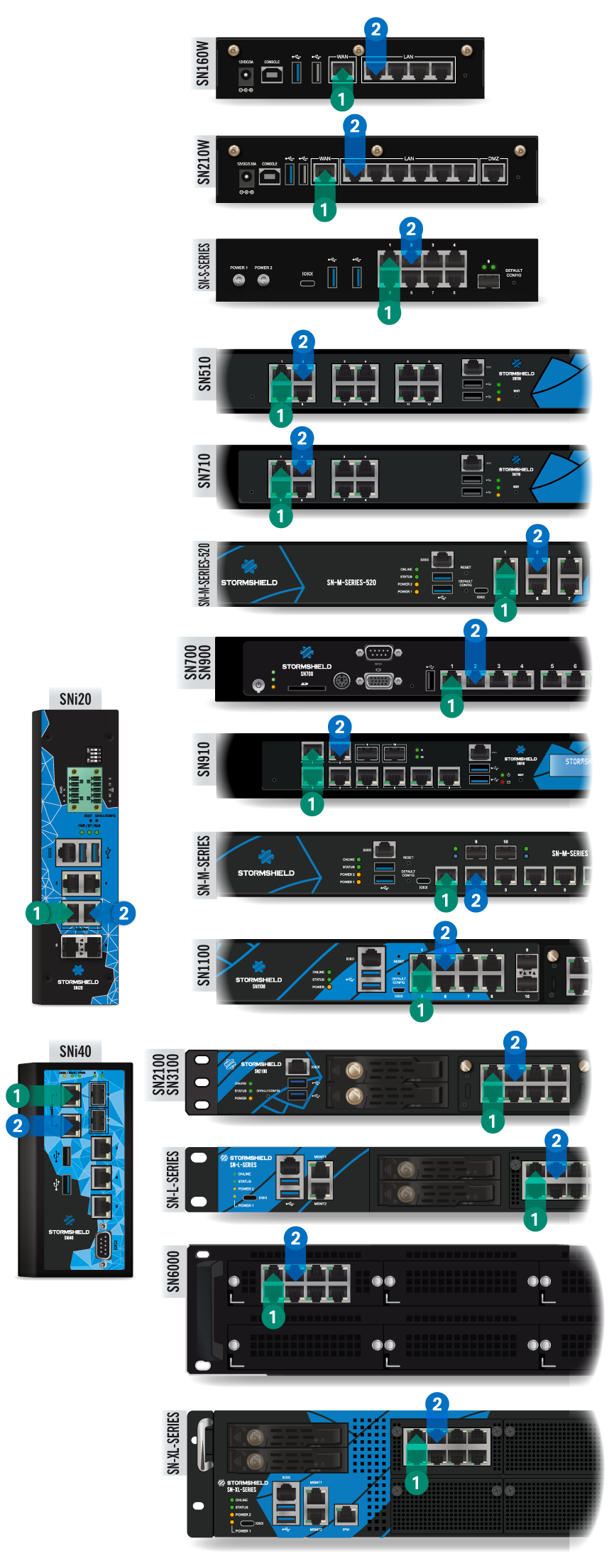 Les ports Ethernet (1Gbe, 2,5Gbe ou 10Gbe) des modèles Stormshield Network de la gamme SN sont configurés en mode auto-sense, ils s’adaptent donc à la configuration du port Ethernet de l’équipement auquel ils sont raccordés. Ces ports sont compatibles avec les câbles Ethernet RJ45 de type droit ou croisé.