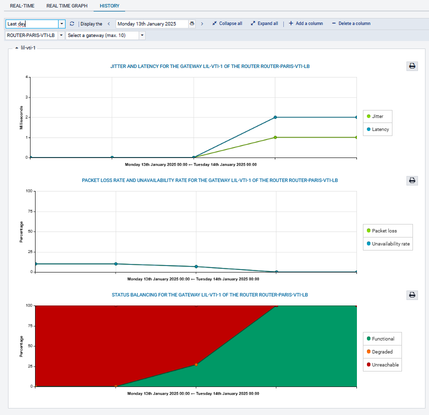 Cet onglet permet de sélectionner une passerelle d'un routeur donné afin d'en afficher les courbes d'évolution des indicateurs SLA suivants sur les dix dernières minutes :