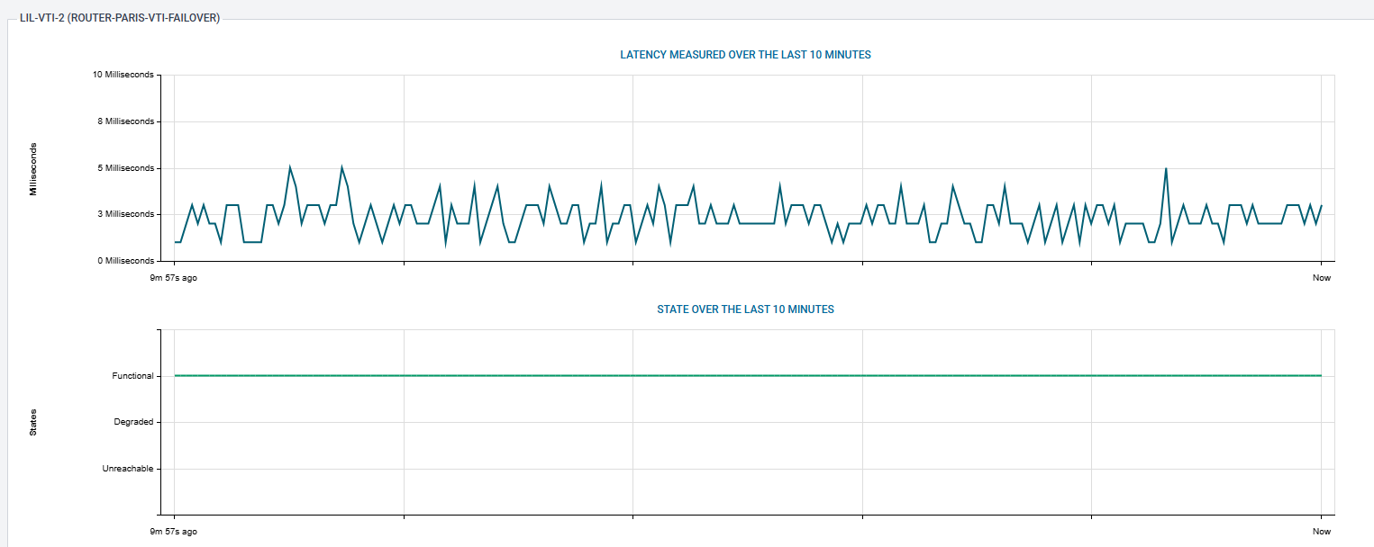 Le module de supervision permet d'afficher l'état des passerelles SD-WAN ainsi que les valeurs des métriques liées aux seuils SLA.