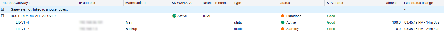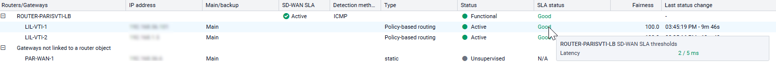 Accessible depuis l'onglet Monitoring > Supervision, le module SD-WAN présente le détail des routeurs et passerelles utilisés dans le routage du firewall (route par défaut, routes statiques et routage par politique).