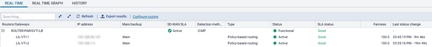 L'onglet Temps réel affiche des informations liées à l'état des routeurs et passerelles supervisés, ainsi que les valeurs SLA SD-WAN de ces passerelles.