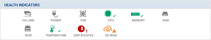 Le tableau de bord SD-WAN, disponible dans l'onglet Monitoring > module Tableau de bord > cadre Indicateurs de santé permet de visualiser en un coup d’œil l'état de tous les objets SD-WAN :