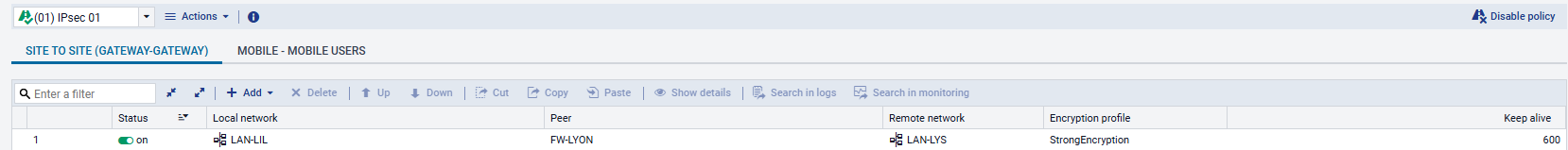 Sur le firewall FW-LILLE, la politique IPsec entre les sites de LILLE et de LYON est donc la suivante :