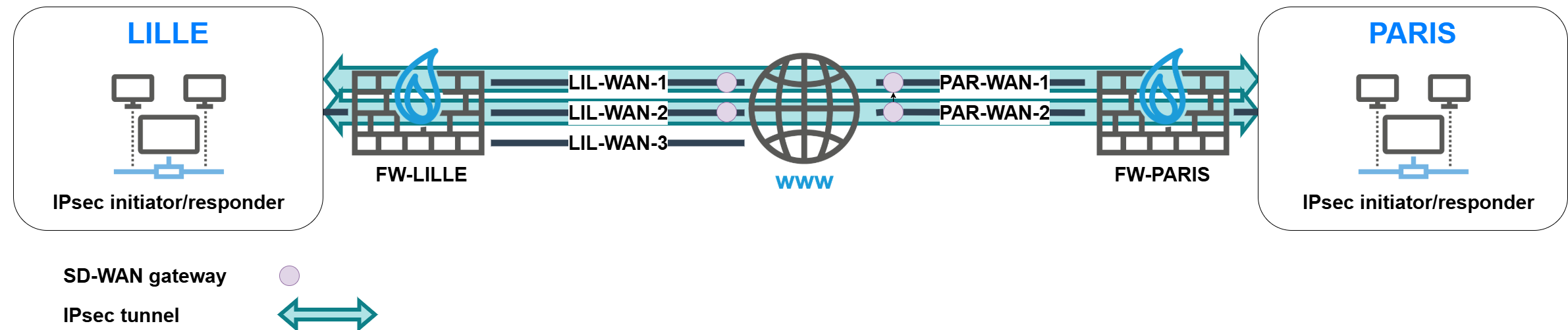 Le firewall FW-LILLE utilise deux routes statiques pour établir des tunnels IPsec avec le site de PARIS au travers des couples d'accès WAN LIL-WAN-1 / PAR-WAN-1 et LIL-WAN-2 / PAR-WAN-2. Ces tunnels sont basés sur des interfaces IPsec virtuelles.