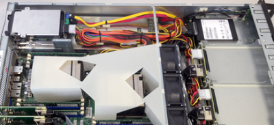 - Levez légèrement l'arrière de la tôle support, et, prenant appui sur la face avant du SSD, extrayez le tout en poussant vers l'arrière du châssis.