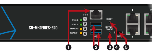 Les ports série (1) et (5) permettent d’accéder au firewall SNS en mode console : il est ainsi possible de s'y connecter depuis un ordinateur.