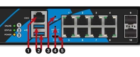 1 : Port série d'accès en mode console 2 : Ports USB 3.0 3 : Bouton Reset (reset électrique) 4 : Bouton de mise en configuration d'usine (defaultconfig) 5 : Port micro USB |
