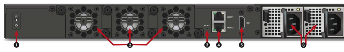 1 : Interrupteur de mise sous / hors tension 2 : Ventilateurs 3 : Bouton Reset (reset électrique) 4 : Ports de management 5 : Port HDMI 6 : Embase(s) secteur |