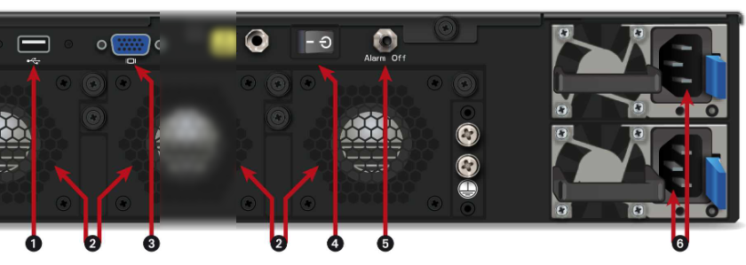1 : Port USB 2.0 2 : Ventilateurs 3 : Port VGA 4 : Interrupteur de mise sous / hors tension 5 : Bouton d'Alarm off 6 : Embases secteur |