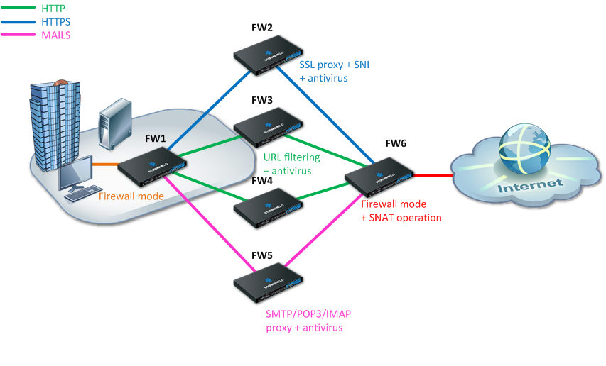 Le deuxième cas présenté dans ce document utilise les objets routeurs et les routes de retour afin de répartir les flux en fonction de leur nature (SSL, HTTP et messagerie) vers des proxies activés sur des firewalls distincts.