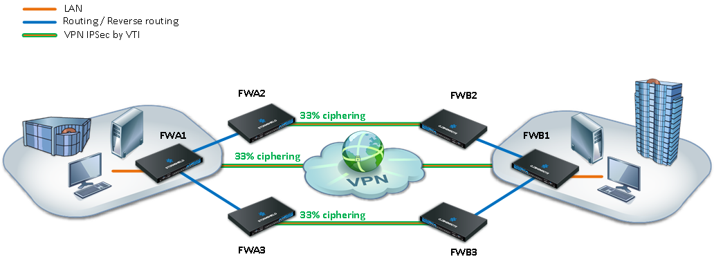 Les tunnels IPsec sont ici basés sur des interfaces virtuelles IPsec (VTI - cf. note technique Interfaces virtuelles IPsec) afin de permettre une décision de chiffrement basée sur le routage, et non plus sur la Security Policy Database (SPD), grâce à la notion d’objets routeurs. Les routes de retour assurent quant à elles le routage des paquets réponse vers le firewall émetteur.