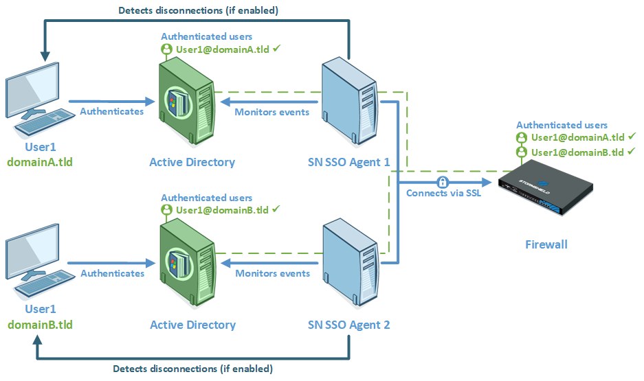 Un firewall peut gérer jusqu'à 5 domaines différents. Dans le cas d'annuaires multiples, un SN SSO Agent est requis par domaine.