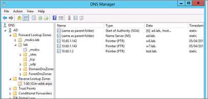 Pour cela, dans les paramètres de votre serveur DNS, il faut ajouter une Zone de recherche inversée ou Reverse lookup zone (clic droit sur le dossier) pour les machines du domaine.