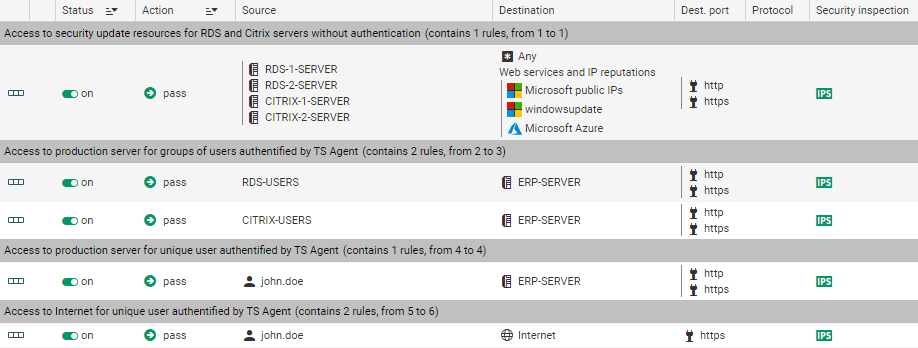 Il est également important de prévoir des règles "d'exception" permettant aux serveurs RDS / Citrix d'accéder aux ressources de mises à jour de sécurité (Microsoft Windows Update et Antivirus par exemple) sans nécessité d'une authentification préalable.