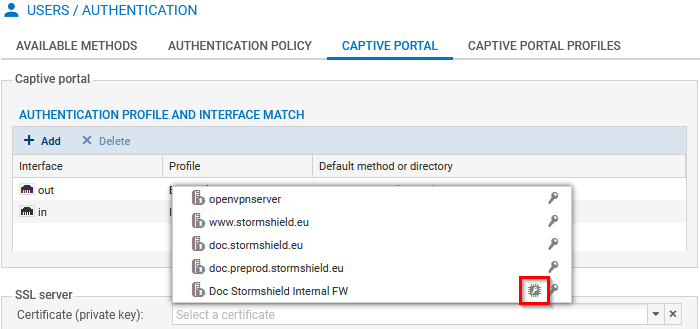 - Rendez-vous dans Configuration > Utilisateurs > Authentification, onglet Portail captif, cadre Serveur SSL.
